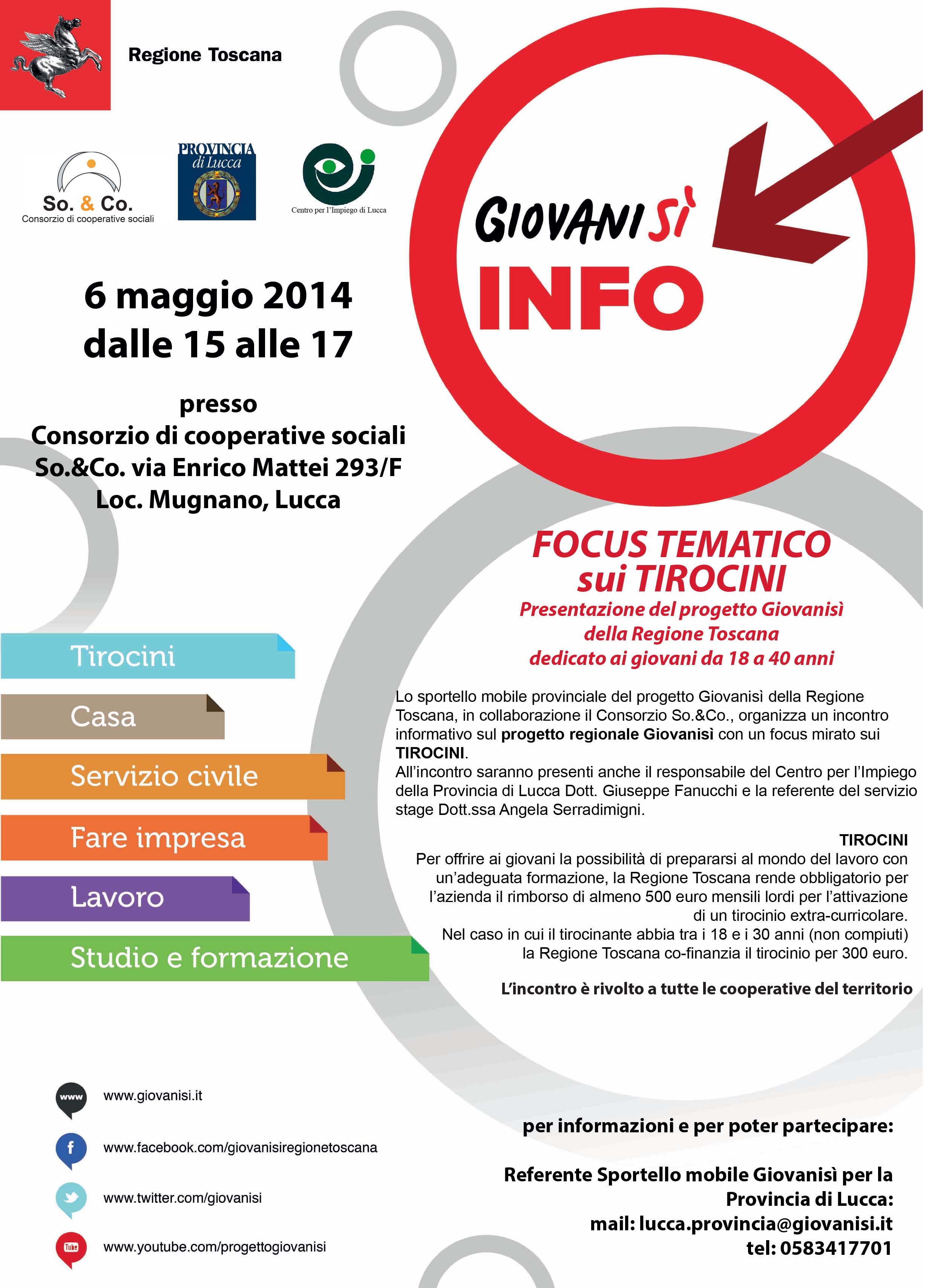 A seguito dell’incontro, si terrà una breve presentazione del progetto “Lavoro, Inclusione, Sviluppo Locale”, finanziato dalla Fondazione Cassa di Risparmio di Lucca, e avente come soggetto promotore il Comune di Lucca e la Caritas diocesana, in collaborazione con l’Amministrazione Provinciale. Tale progetto si propone di sostenere economicamente l’inserimento lavorativo di giovani e adulti presso aziende del territorio, usufruendo, tra gli altri, dei tirocini Giovani Sì e di voucher per prestazione occasionale.